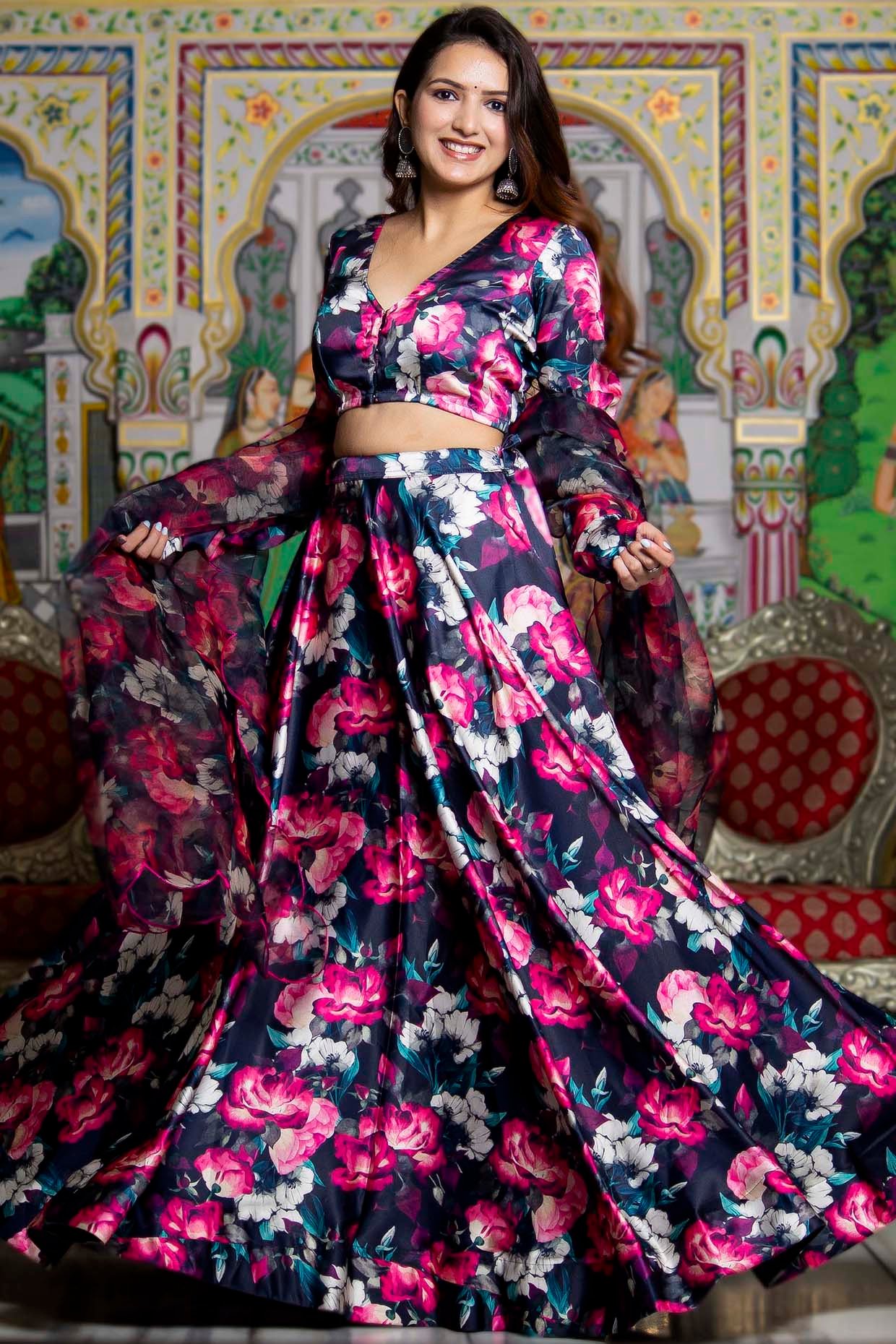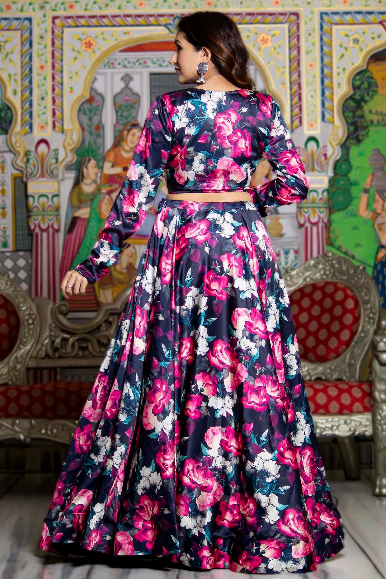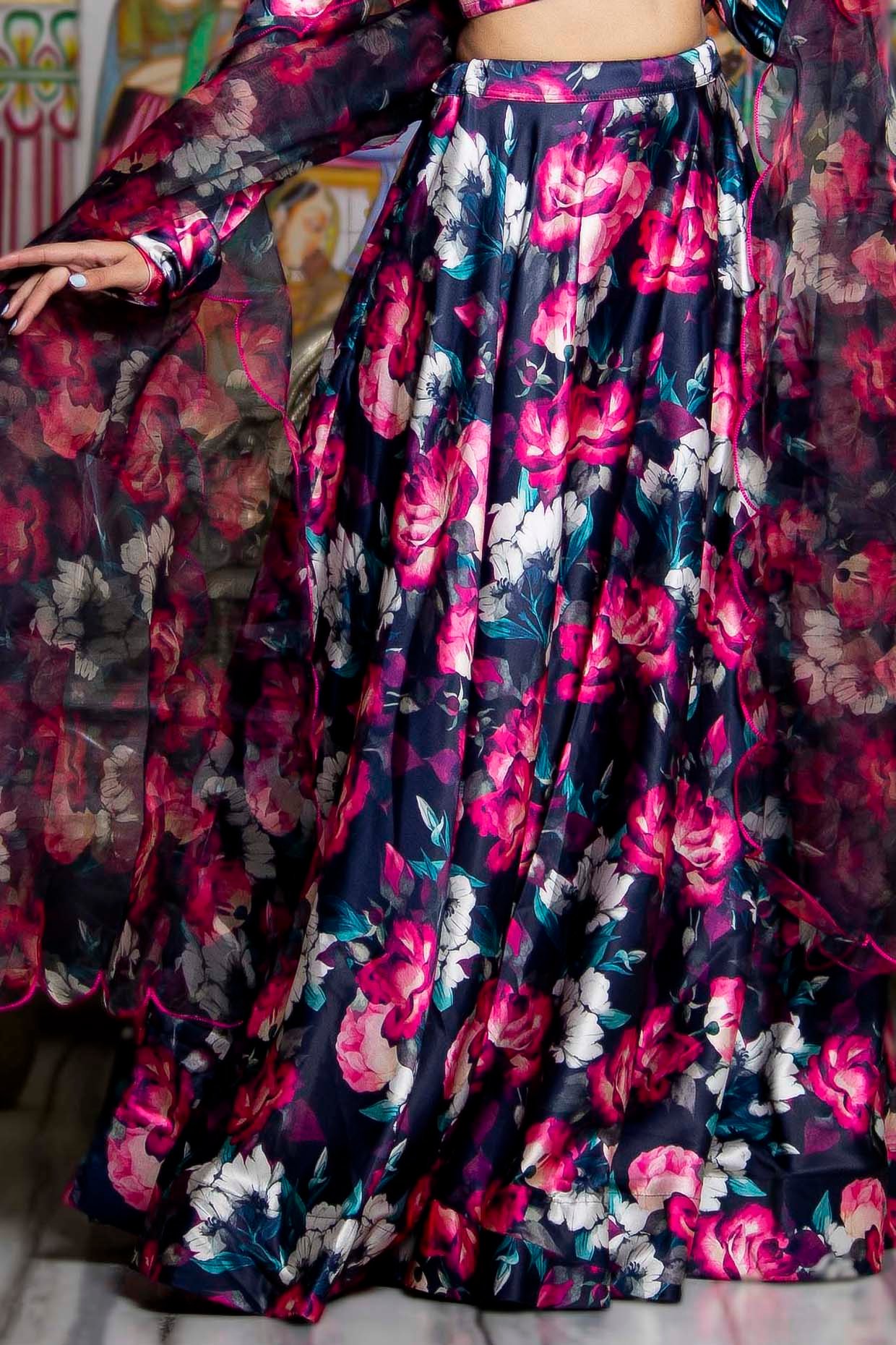 Bannhi features a Black Flared Lehenga Set that captivates with its elegance. The eye-catching lehenga is crafted in satin with floral print. It is paired with a blouse and a sheer organza dupatta. Accessorize the designer lehenga set with statement earrings and heels for an engagement ceremony or sangeet ceremony.