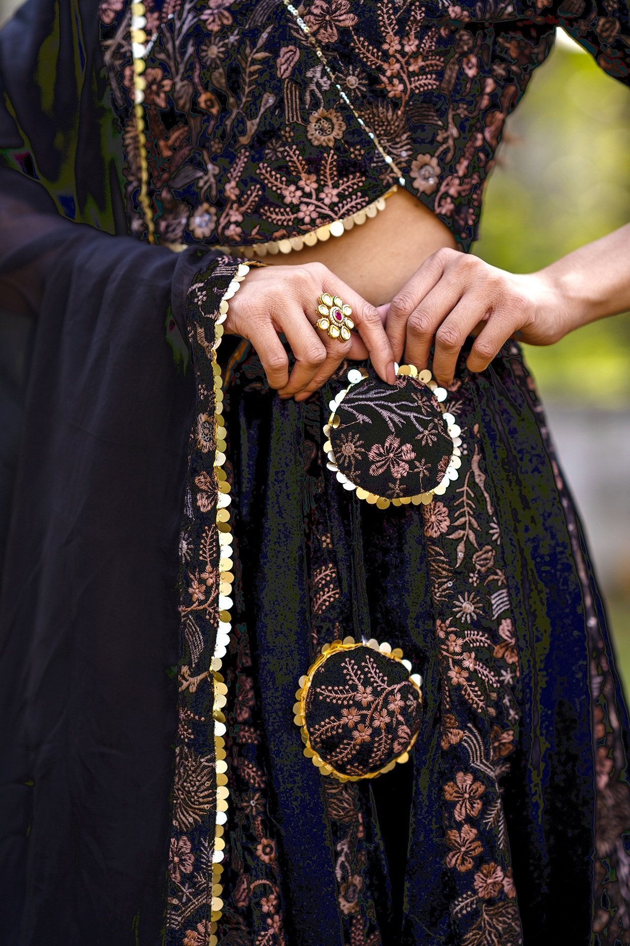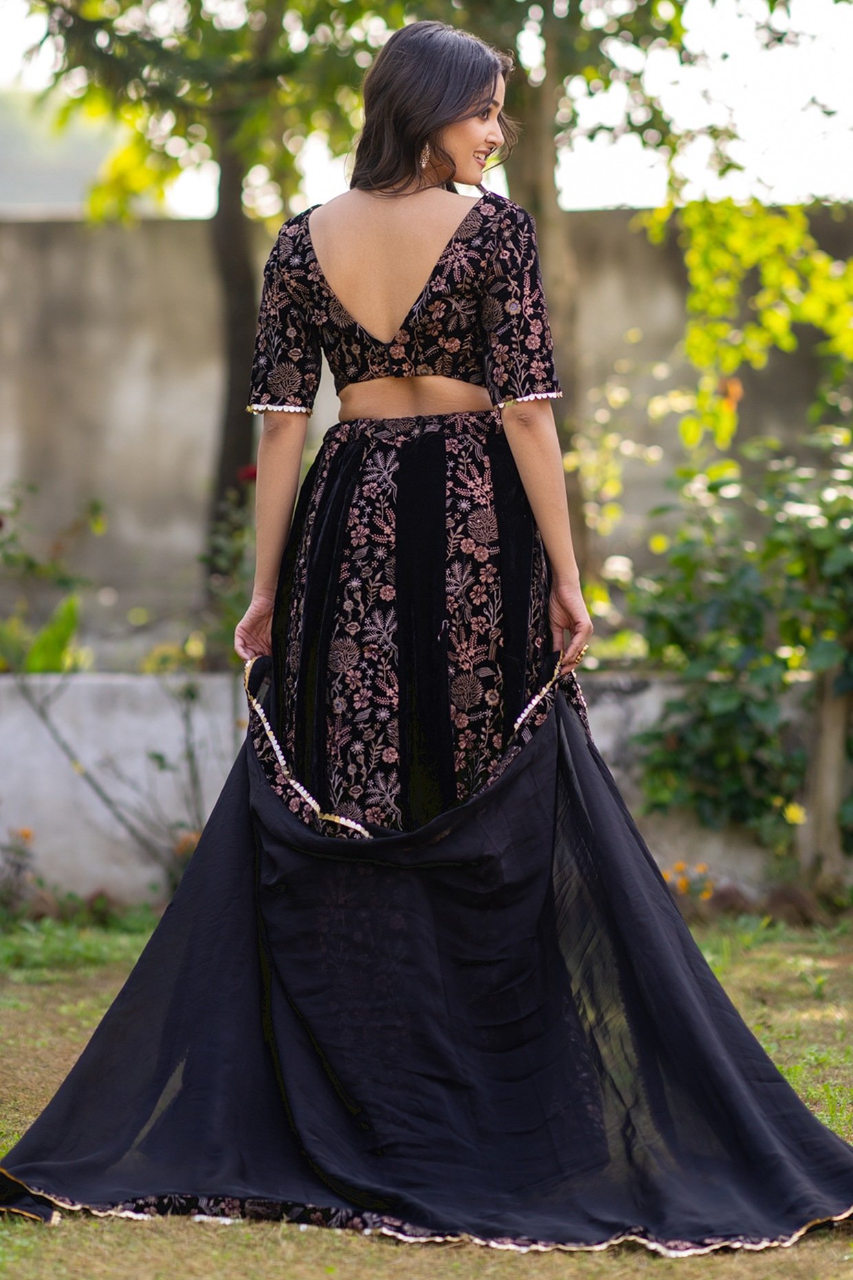 PRODUCT DESCRIPTION Featuring a black kalidar lehenga in a velvet base with lace and sequins embroidery. It is paired with a blouse and a dupatta. Accentuate it with statement jewellery and heels for an engagement or sangeet ceremony. Components 3 FIT Fitted at the bust and waist. COMPOSITION Velvet. CARE Dry clean only.