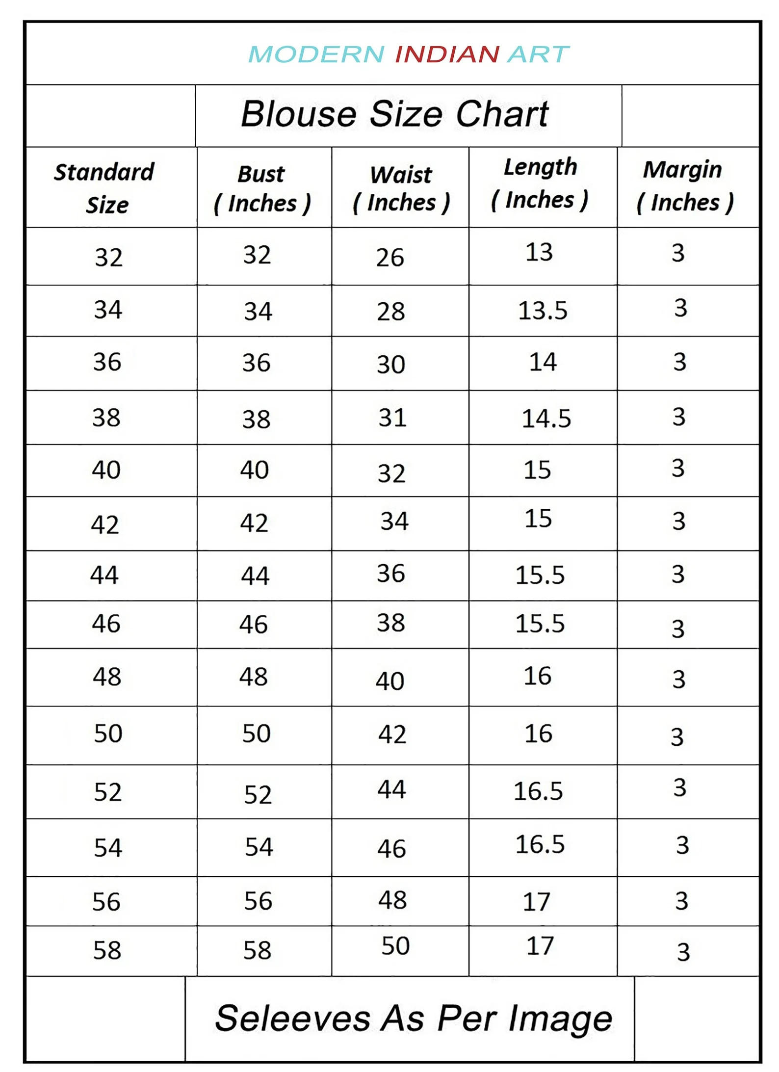 The blouse size is based upon bust all round measurement, for example if your bust size is 41 or 42 inches please select 42 bust from our store