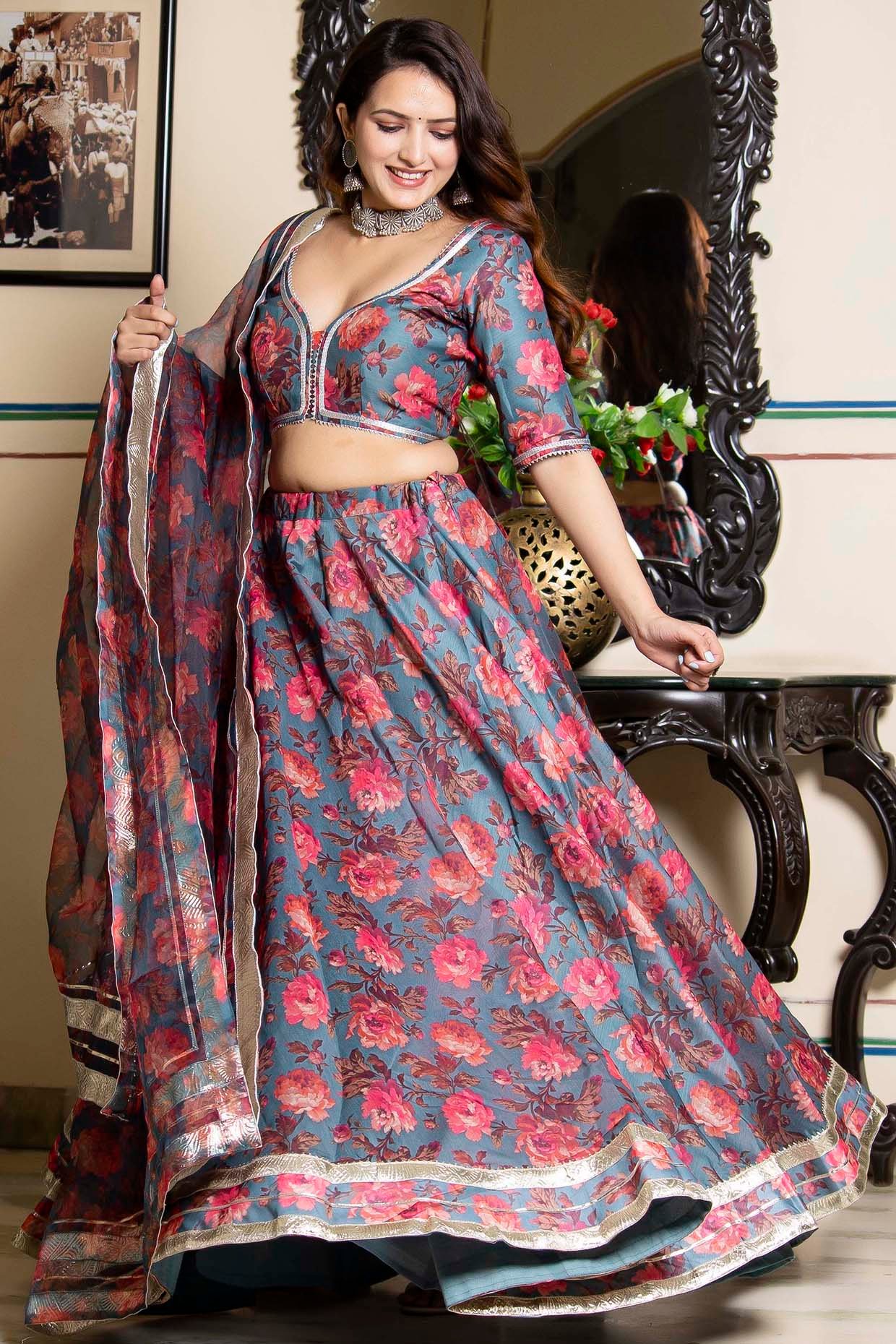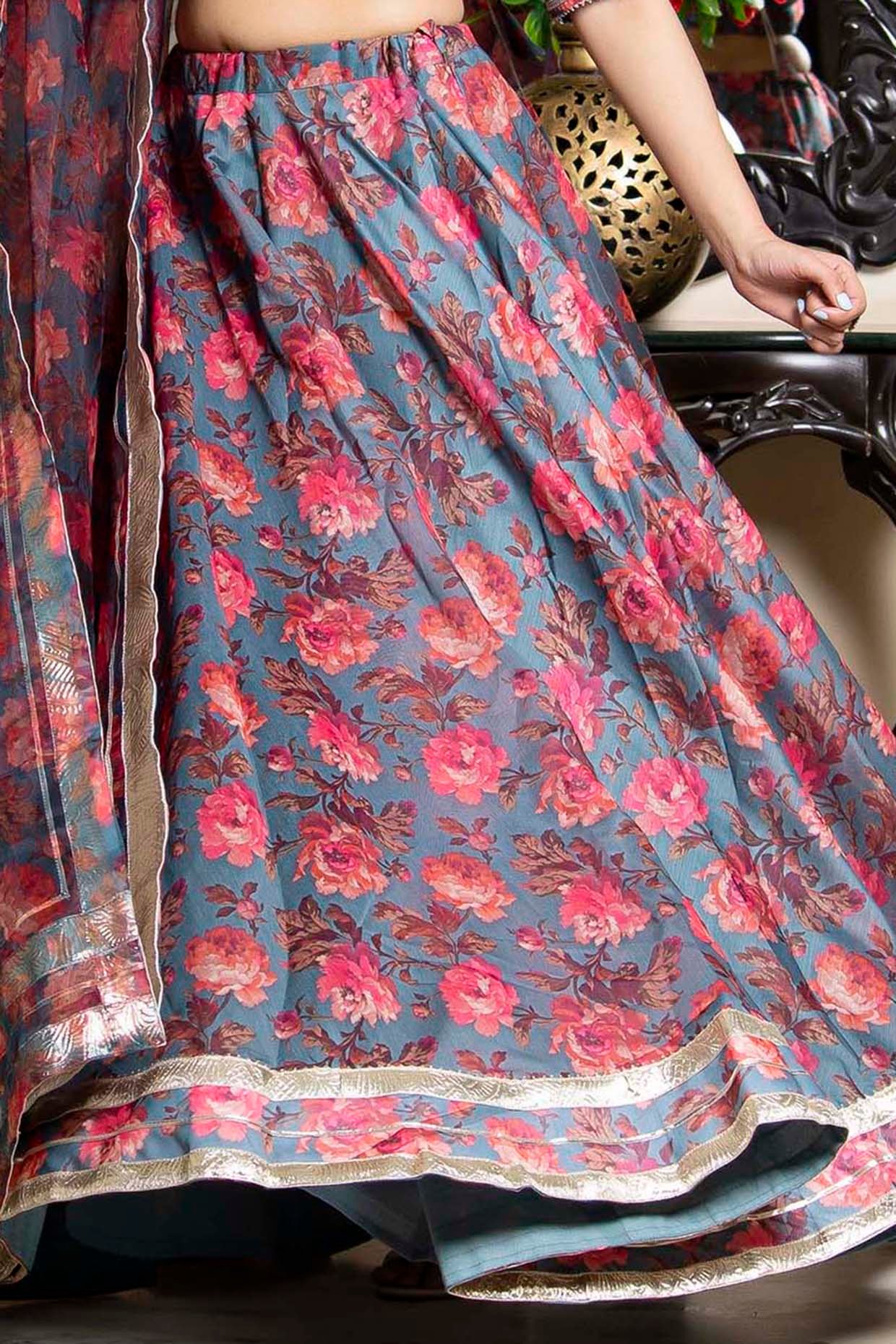 Bannhi features a Grey Flared Lehenga Set that captivates with its elegance. The eye-catching lehenga is crafted in chanderi with floral print and gota details. It is paired with a blouse and a sheer organza dupatta. Accessorize the designer lehenga set with statement earrings and heels for a festive occasion or engagement ceremony.