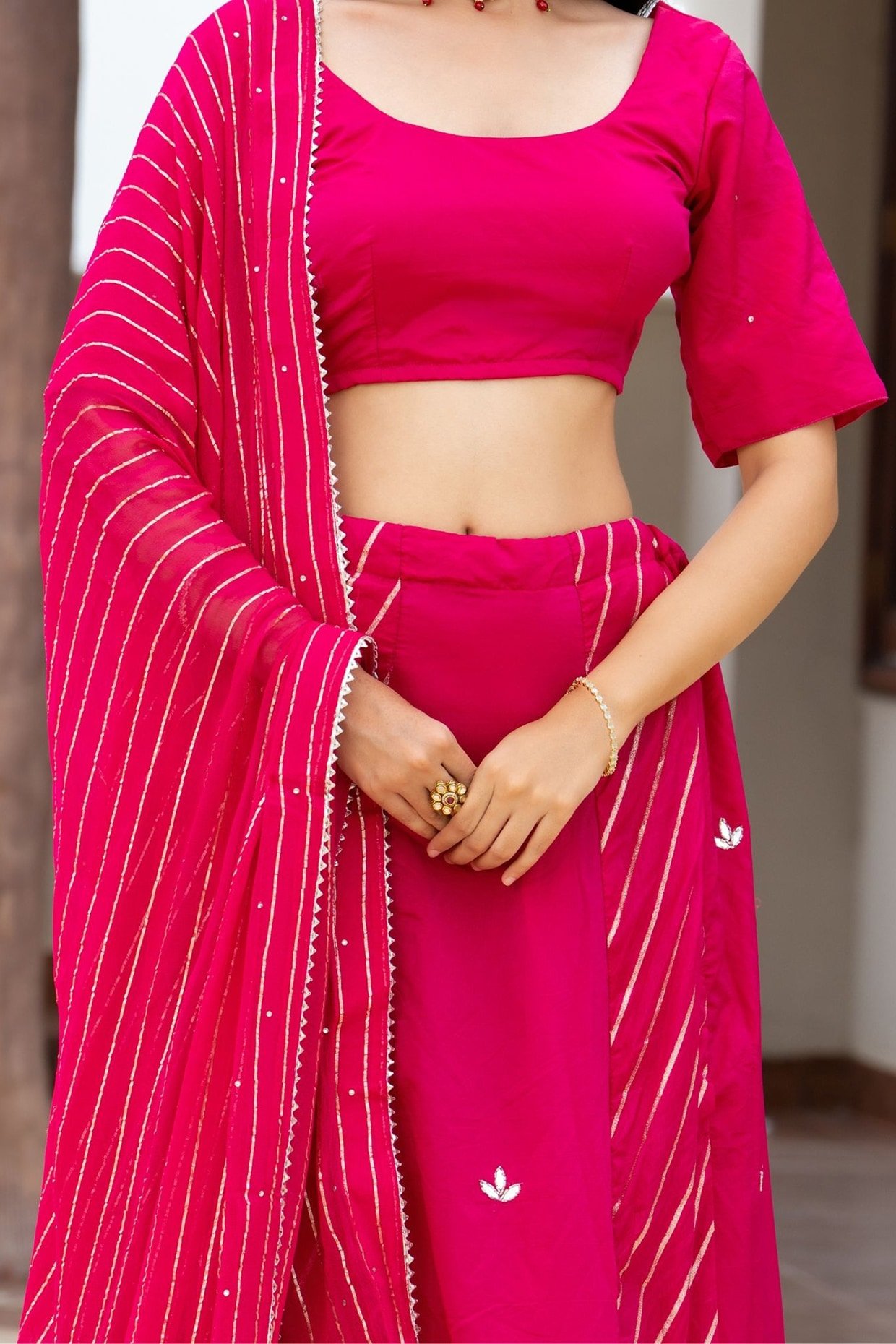 PRODUCT DESCRIPTION Featuring a Pink lehenga in silk blend base. It is paired with a blouse and a dupatta. Accentuate it with diamond jewellery and block heels for sangeet, engagement ceremonies or weddings