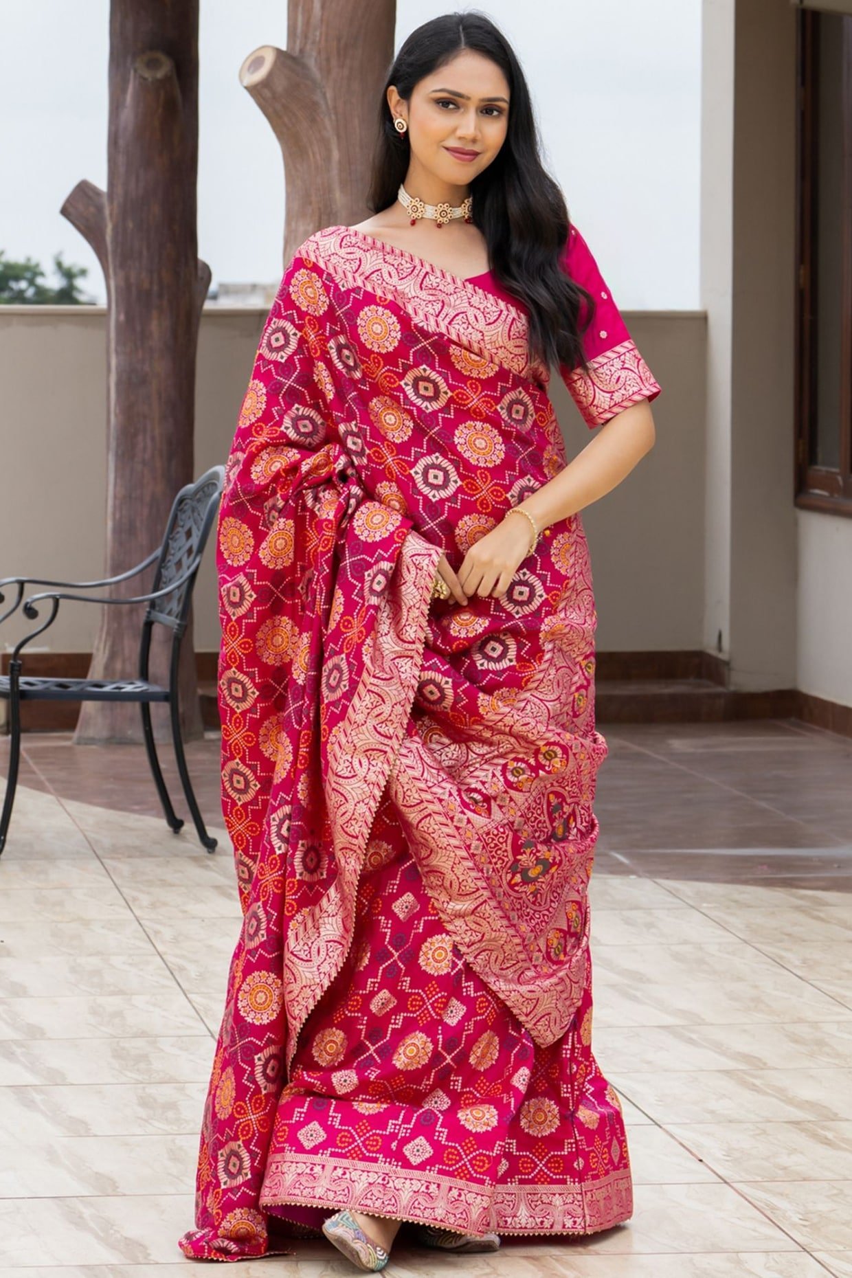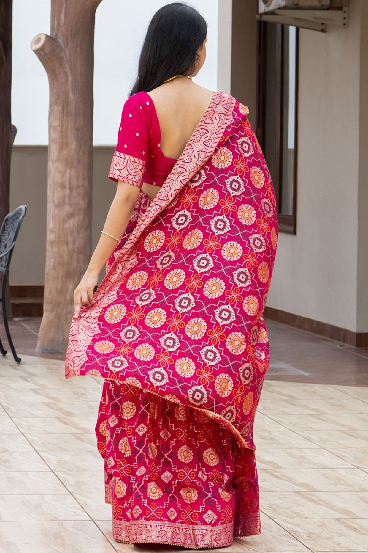 PRODUCT DESCRIPTION Featuring a Rani Pink lehenga in silk blend base. It is paired with a blouse and a dupatta. Accentuate it with diamond jewellery and block heels for sangeet, engagement ceremonies or weddings
