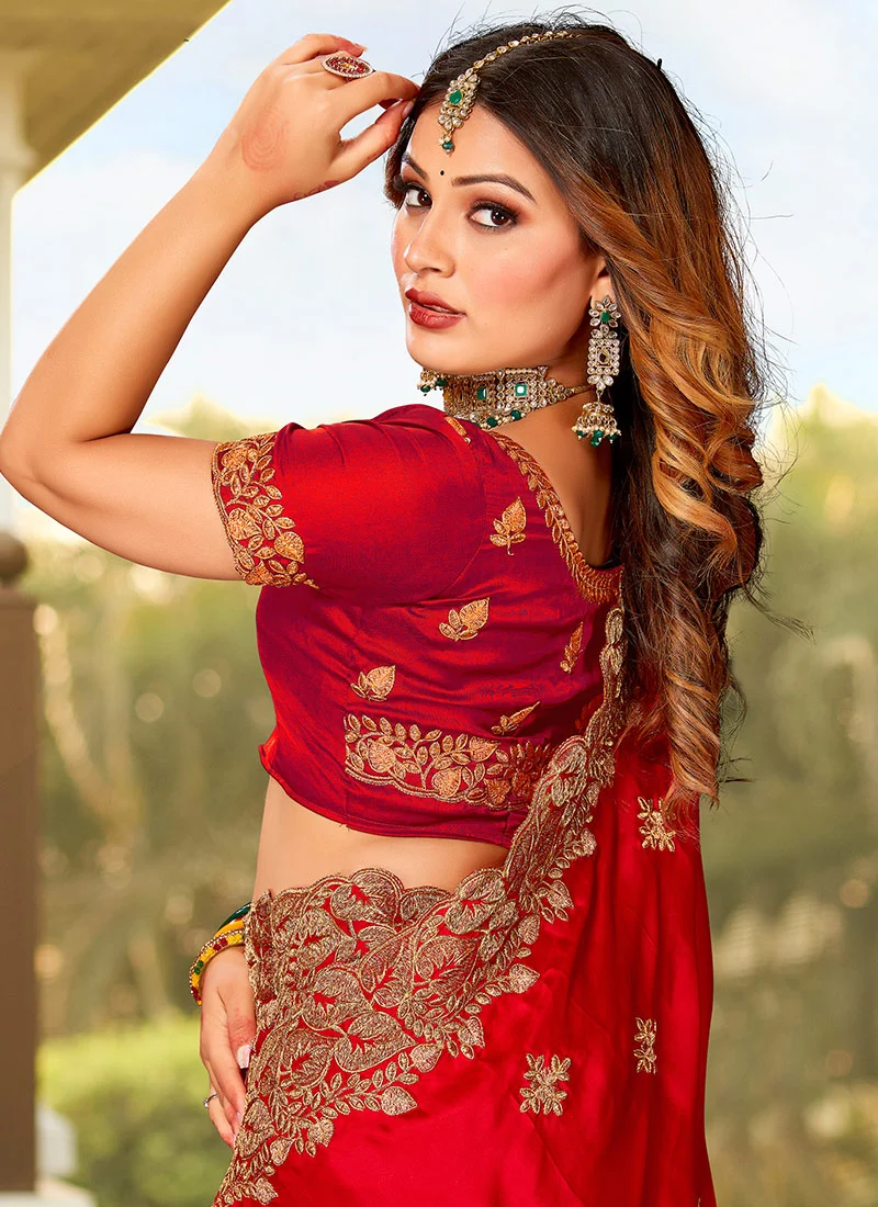 The Red Satin Blend Embroidered Saree is a stunning piece of ethnic attire that embodies elegance tradition and modern fashion sensibilities. Crafted with meticulous attention to detail this saree is a perfect blend of timeless grace and contemporary style. The rich red hue of the satin fabric exudes sophistication and warmth making it an ideal choice for special occasions such as weddings parties and festivals. The soft and smooth texture of the satin blend fabric drapes beautifully enhancing the wearers silhouette and adding a touch of glamour to any event. One of the standout features of this saree is its intricate embroidery work. Delicate and elaborate embroidery adorns the saree creating exquisite patterns and motifs that catch the eye. The embroidery is done with precision and skill using fine threads and embellishments that add a touch of opulence to the overall design. The craftsmanship reflects the expertise of skilled artisans who have poured their creativity and dedication into every stitch making this saree a true work of art. The saree is adorned with tasteful embellishments that enhance its overall appeal. Shimmering sequins dazzling stones and intricate zari work are meticulously incorporated into the design adding a subtle sparkle that catches the light and creates a mesmerizing effect. These embellishments not only elevate the aesthetic appeal of the saree but also make it perfect for evening events and celebrations. The pallu of the saree is particularly noteworthy featuring elaborate embroidery and a border that frames the drape beautifully. The attention to detail in the pallu design showcases the craftsmanship of the artisans and adds a touch of grandeur to the ensemble. The saree comes with a matching blouse piece that complements the overall look allowing the wearer to customize the blouse according to their preferences. In summary the Red Satin Blend Embroidered Saree is a masterpiece that combines luxurious fabric exquisite embroidery and tasteful embellishments to create a saree that is both visually stunning and culturally rich. It is a testament to the rich heritage of Indian craftsmanship and a musthave addition to any discerning fashion enthusiasts wardrobe. Wearing this saree is not just a fashion choice it is a celebration of artistry culture and individuality.
