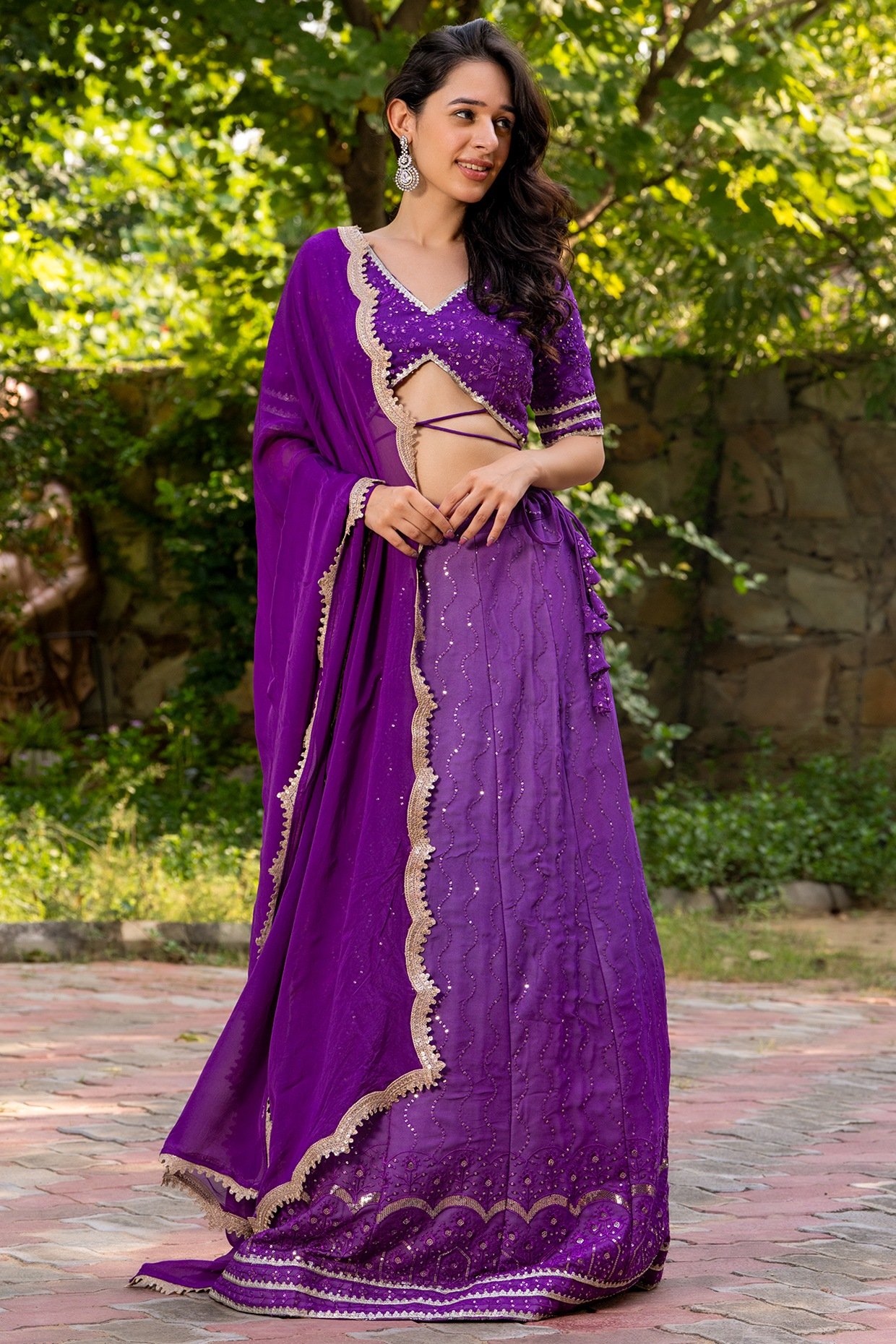 Featuring a violet lehenga in georgette base with embroidery and lace detailing on the hem. It is paired with a sequin-embroidered blouse and an organza dupatta. Accentuate it with dangler earrings and heels for a wedding or festive occasion.